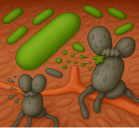 An illustration of Novel QUATTRO™ (Green Cells) excreting “bacteriocins” to kill pathogens such as Clostridia (Grey Cells).