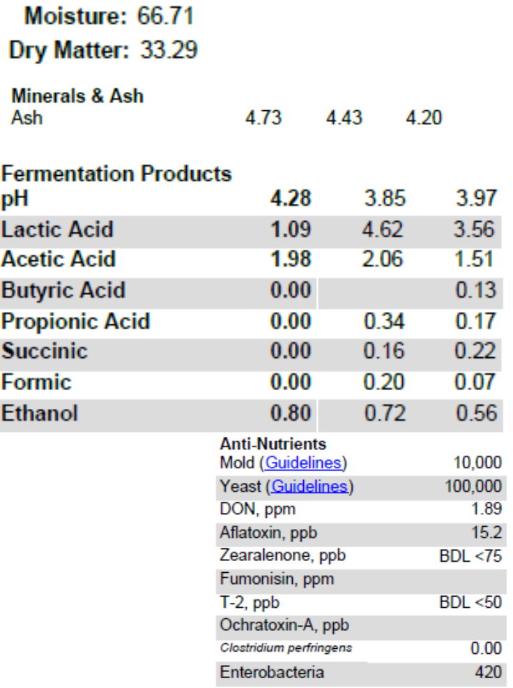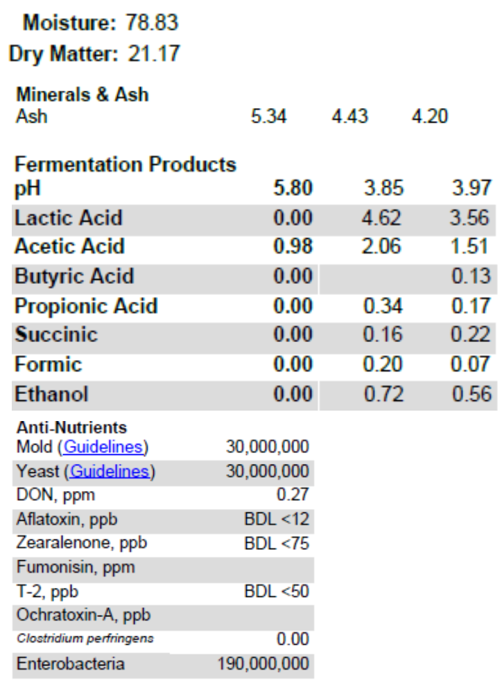 Below are samples from 38% DM Corn Silage in Idaho. The lab results show a dramatic change in DM and ash which are both signs of large losses. The Anti-Nutrients section shows just how contaminated this silage is if left untreated.
